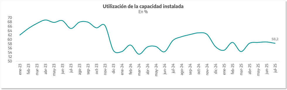 En julio de 2025, el uso de la capacidad instalada alcanzó a penas el 58,2% cayendo nuevamente de manera mensual y reflejando el efecto de la menor producción industrial en dicho mes.