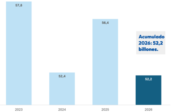 La recaudación acumulada a marzo de 2026 vuelve a mostrar debilidad en términos reales. Se ubica por debajo de 2023 (-9,6%) y prácticamente en línea con 2024 (- 0,4%). La caída se explica principalmente por menores ingresos en IVA y derechos de exportación, junto con el retroceso del Impuesto PAIS.